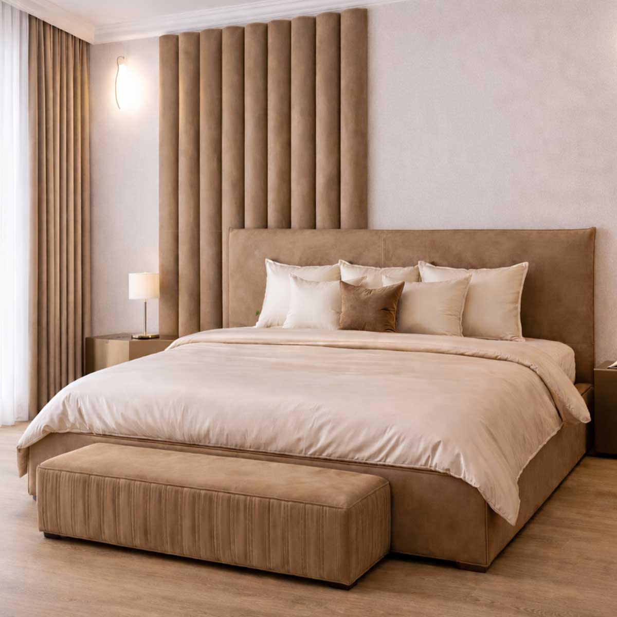 Panourile tapitate IMPERIUM sunt concepute pentru a completa patul și pentru a crea un decor coerent, elegant și sofisticat în zona de dormit. Realizate din piele naturală premium și montate în spatele tăbliei, aceste panouri adaugă profunzime vizuală și un caracter arhitectural spațiului.