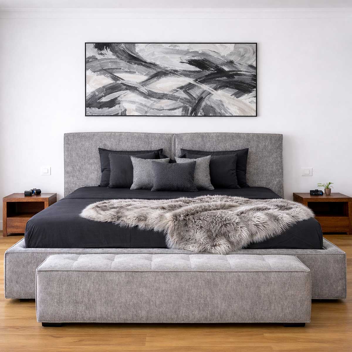 Această stofă transformă patul într-un element central al dormitorului, fără a domina vizual spațiul.